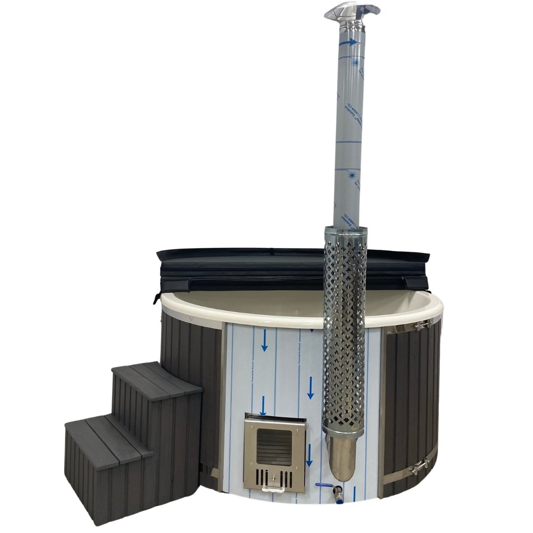The hot tub is powered by an integrated stainless steel stove (AISI 316), known for its corrosion resistance and efficient heat transfer. Paired with a 2-meter chimney featuring a heat-protective grille and chimney cap, the system heats water from 5 °C to 38 °C in just 2–3 hours. The stove is compatible with firewood up to 40 cm in length and delivers a power output of 30 kW.
