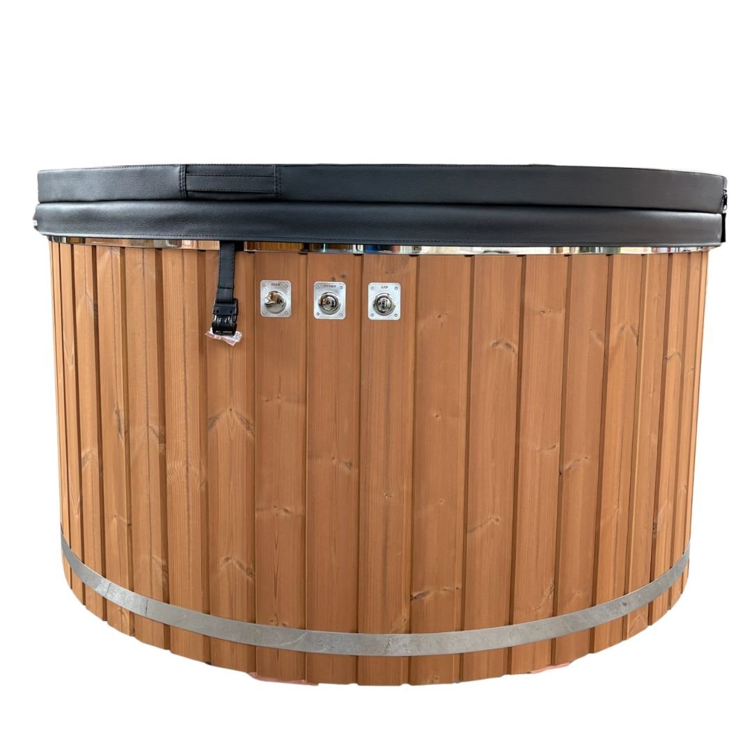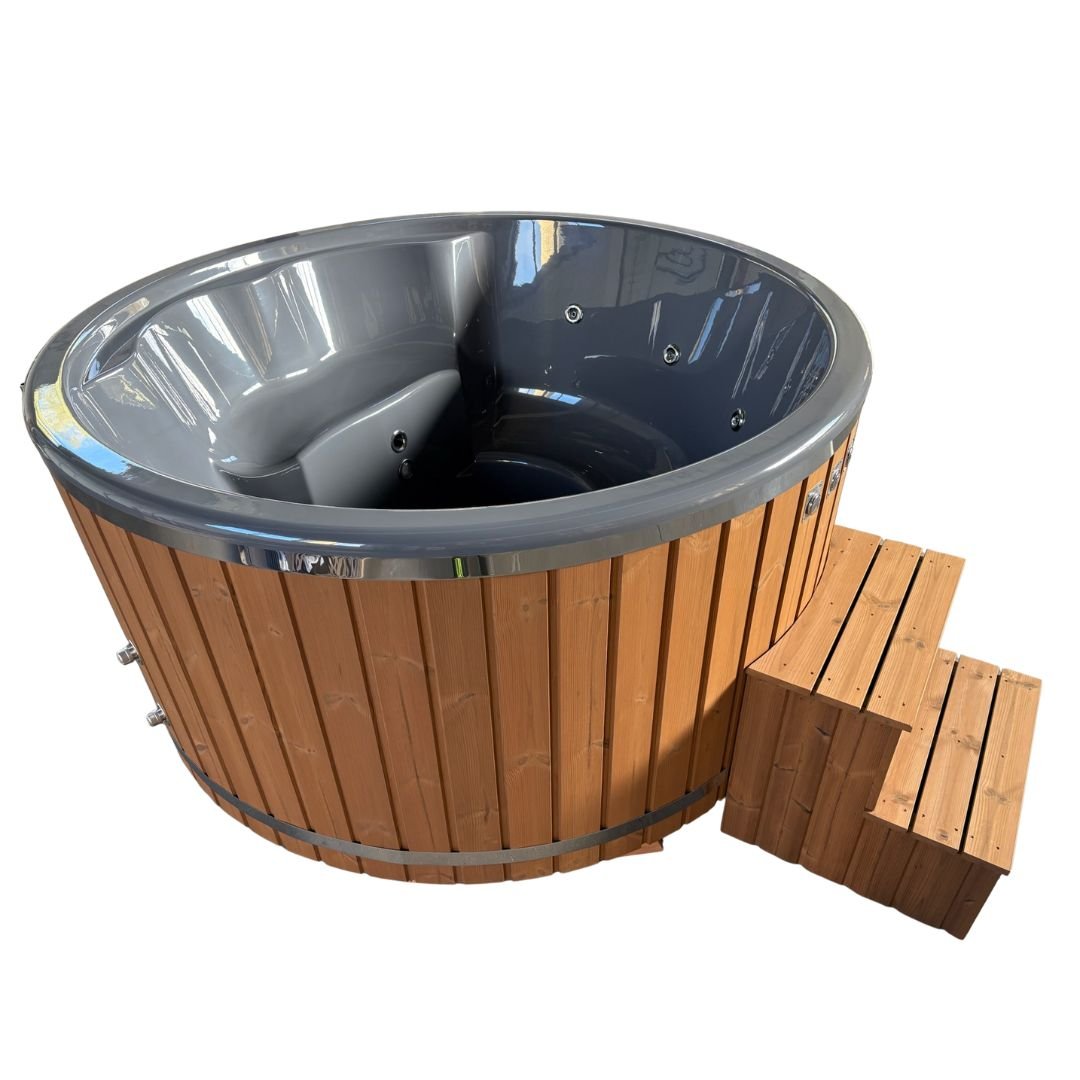 This medium-sized hot tub (200 cm external diameter) is designed to comfortably accommodate 4–5 persons, making it a perfect fit for couples or small families. The natural-oiled thermowood exterior gives the hot tub a warm, organic feel that integrates beautifully into any outdoor space. Inside, the smooth grey fiberglass liner adds a clean and timeless look while offering excellent comfort and durability.